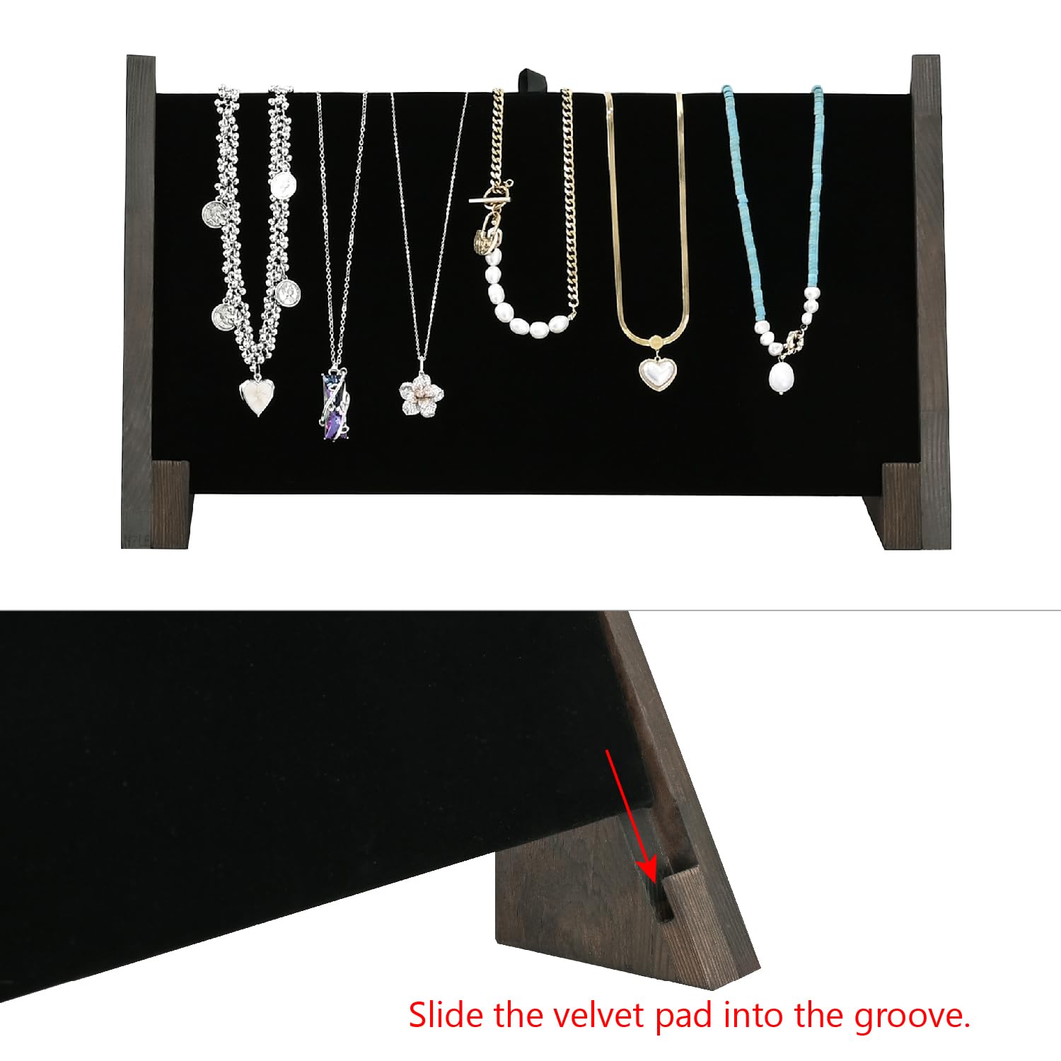 - NECKLACE DISPLAY: This wooden necklace display stand is designed to accommodate up to 9 necklaces simultaneously. It features assembled jewelry pads and an easel for added stability. The stand's simple yet elegant design ensures a sophisticated and effortless presentation of your jewelry collection.s presentation, adding a touch of style to any space. This stand is not just a display, but a versatile solution for your jewelry organization needs.