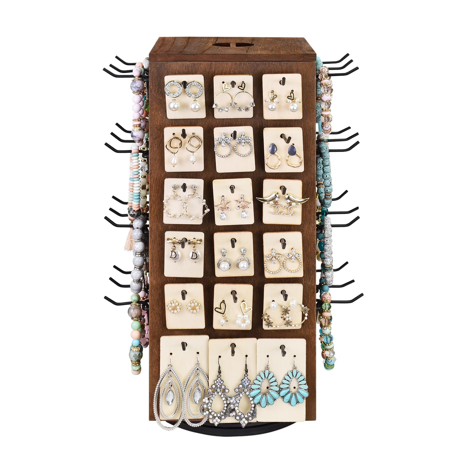 MOOCA Wooden Rotating Four-Sided Pegboard Jewelry Accessories Rack, Rotating Jewelry Display with a Lid for Large Inner Storage Space, 48 Removable Black Hooks, Brown Color